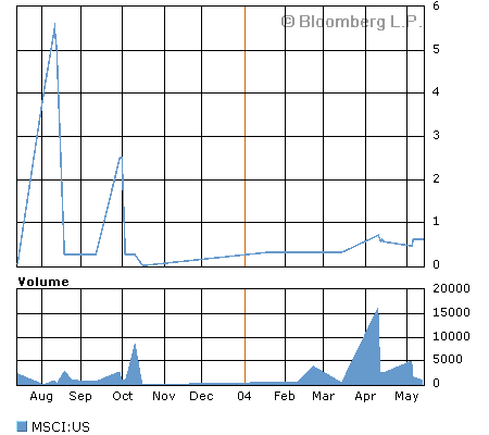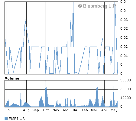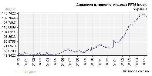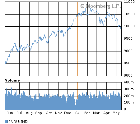 Рис. 1.2 Индекс ПФТС за 2003-2004 г.г. [15] К сожалению, в этой сфере будет ощущаться влияние достаточно весомых и, в то же время, разнонаправленных по направлению действия факторов. С одной стороны политические факторы, которые, безусловно, будут способствовать понижению рынка, с другой стороны, экономические факторы. Поскольку последние полгода мы были свидетелями доминирования как раз экономический факторов, поэтому существуют достаточно весомые основания предположить, что сила их действия будет значительной и в дальнейшем. Осталось разобраться только с тем, в каком направлении они будут двигать рынок. Макроэкономические данные заставляют думать о перспективах рынка с большой долей оптимизма. Объем промышленного производства в Украине в январе-апреле 2004 года вырос на 17,7% по сравнению с аналогичным периодом прошлого года, в том числе в апреле — на 14,1%. В финансовом секторе прибыль украинских банков, а это самые главные инвесторы отечественного рынка, за январь-апрель увеличилась на 70,5% по сравнению с аналогичным периодом прошлого года и на 1 мая составила 403,5 млн. гривен. Оживление конъюнктуры рынка можно также связывать с предстоящими приватизационными продажами. Фонд государственного имущества Украины 12 мая 2004 г., объявил конкурс по продаже 93,02% акций ОАО «Криворожсталь». За этот объект ожидается серьезная борьба среди отечественных бизнес-групп, а также нельзя исключать возможность международных инвесторов. В целом эта продажа оценивается на сумму около $1 млрд., что составляет одну двенадцатую часть государственного бюджета Украины. Очевидно, что попадание этой суммы в систему государственных финансов радикальны образом должно отразиться на конъюнктуре первичного рынка государственного долга. Таким образом, есть веские основания надеяться, что экономические факторы будут способствовать росту. Однако, как известно, в любой бочке меда есть ложка дегтя. Эта ложка – конъюнктура на внешних финансовых рынках. По данным The Wall Street Journal многие мировые инвесторы пересматривают свои планы в странах с развивающейся экономикой на оставшуюся часть года. Американские фонды, инвестирующие в emerging markets, зафиксировали на неделе, завершившейся 5 мая, отток средств на сумму $411 млн. За последние 8 недель отток средств из фондов, инвестирующих в развивающиеся экономики, происходил в течение 6 недель. Трейдеры также отмечают, что хеджевые фонды уже начали выводить средства из emerging markets. Доходы от инвестиций в страны с развивающейся экономикой сейчас также демонстрируют тенденцию к снижению. Индекс MSCI (рис. 1.3 [14]), рассчитываемый для emerging markets, с начала года опустился на 10% с максимального уровня в начале года. Облигации стран emerging markets резко упали в цене после того, как на рынке после публикации благоприятных данных о состоянии рынка труда в США усилились ожидания скорого повышения процентных ставок в Америке. Глобальный индекс J.P.Morgan EMBI+ Global (рис.1.4 [14]) упал на 2,1%, а средний спрэд по облигациям emerging markets вырос на 0,25 процентного пункта до 5,15 процентного пункта. На рис. 1.5 представлен индекс Доу-Джонса – он отражает состояние рынка огромных компаний («голубые фишки» - blue chips – компании с рыночной стоимостью больше 5 миллиардов долларов [13]).