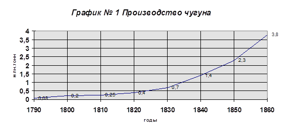 истории английской металлургии. Из-за роста строительства хлопчатобумажных фабрик произошло резкое повышение спроса на металл. Введение метода пудлингования ускорило ход промышленного переворота. В результате нетрудно заметить быстрый рост производства чугуна (граф. № 1), а затем и стали. Начался подъем угольной промышленности. Уголь широко использовался в металлургии, а также для приведения в действие первых машин. Свой вклад в развитие английской промышленности вложили войны. Которые велись на европейском континенте. Этот период с конца 18 века до 1815 года явился важным этапом экономического подъема Англии. Война стимулировала развитие некоторых отраслей производства, связанных главным образом с военными нуждами. Сильный толчок был дан развитию тяжелой промышленности. Большие успехи были достигнуты в обработке металлов. Англия вышла из войны еще более сильной промышленной державой. Так производство металла резко возросло: выплавка железа, составлявшая в 1788 году 68 тыс.тонн, а в 1806 году достигла 850 тыс.тонн. Особенно быстро возросло хлопчатобумажное производство: ввоз хлопка в Англию за период с 1785 по 1815 год вырос с 17,9 млн. До 56 млн. Весовых фунтов, а производство тканей из хлопка за те же годы увеличилось с 3,6 млн. до 40 млн. метров. Причины такого благотворительного действия войны на экономику Англии в следующем: во-первых, территория этой страны не была затронута военными действиями, хозяйство не страдало от разорения, во-вторых Англия являлась источником снабжения воюющих стран, в-третьих, с целью облегчить союзникам закупки, правительство давало им субсидии, большая часть которых оставалась в Англии, став по существу формой поощрения английской экономики. Итак, промышленный переворот в Англии продолжался, однако в данных условиях обнаружилось, что старые средства транспорта стали сдерживать рост крупной промышленности. Вначале модернизация транспорта означала строительство каналов и благоустройство судоходных рек. Но начиная с 1825 года в Англии развернулось строительство железных дорог. В 40-50-е годы 19 столетия промышленный переворот охватил морской флот; началось строительство больших океанских пароходов. Так уже в середине 19 столетия протяженность английских железных дорог составила свыше 25 тысяч км, а удельный вес английского торгового флота в мировом тоннаже составил свыше 70%. Так как промышленный переворот опирался на принципиально новую технику в Англии зародилось и начало развиваться машиностроение. Первые английские машины были построены еще мануфактурным способом. Но поскольку машиностроение имело массовый характер возникли предпосылки для изобретения машин, производящих машины. Индустриализация этой отрасли началась в самом начале 19 столетия, а произошла лишь в середине 19 века. Становление машиностроения означало завершение промышленного переворота в Англии. Таким образом, начиная с 60-х годов 18 века в Англии наблюдается значительный прогресс производительных сил. Изобретения, сделанные в промышленности, явились толчком к развитию всей экономики. Они повлекли за собой важные изменения в организации производства, сказались на развитии сельского хозяйства, вызвали рост торговли и улучшение транспорта, наконец привели к росту и передвижению населения из деревни в город, из одних районов стра
