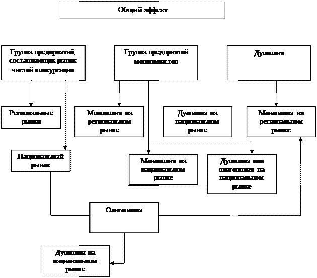 Рис. 1. Классификация рыночных конкурентных структур в переходный период развития Украинской экономики (рынки товаров производственного потребления). 4.Монополизм в экономике Украины. Антимонопольное регулирование. 4.1. Формы монополий и следствия монополизации экономики. Современная экономичная теория различает несколько видов монополистических состояний: простая или полная (чистая) монополия, олигополия, монопсония, олигопсония. Полная или чистая монополия означает ситуацию, если существует единый производитель или продавец какого-либо вида продукции. Это означает, что исключительное право на владение и распоряжение определенным материальным или нематериальным благом сосредоточивается в одних руках. В условиях чистой монополии область состоит из одной фирмы, то есть понятие “фирма” и “область” совпадают. На первый взгляд такая ситуация маловероятная и, действительно, в масштабах страны встречается очень редко. Тем не менее, если взять более скромный масштаб, например, маленький городок, то ситуация, где наблюдается чистая монополия будет довольно типичной. В таком городке существует одна электростанция, одна железная дорога, единый аэропорт, один банк, одно крупное предприятие и т.д. Для примера: в США 5% ВНП создается в условиях, близких к чистой монополии. Чистая монополия возникает обычно там, где отсутствуют реальные альтернативы, нет близких заменителей (субститутов), товар, который выпускается, есть в некоторой мере уникальным. Это в полной мере можно отнести к естественным монополиям, типичным примером которых есть муниципальные коммунальные службы. В этих условиях монополист владеет реальной властью с точки зрения реализации продукта, в некоторой мере контролирует цену и может влиять на нее, изменяя количество товара. Монополия возникает там и тогда, если барьеры для входа в область тяжело преодолеть. Государство создает официальные барьеры, выдавая патенты и лицензии. В соответствии с патентным законодательством США, изобретатель имеет исключительное право контроля над своим изобретением на протяжении 17 лет. Патенты сыграли огромную роль в развития таких компаний, как “XEROX”, “Eastman Kodak”, “International Business Machine” (IBM), “SONY” и т.д. Вступление к области может быть существенным образом ограниченный и путем выдачи лицензий. В США подлежат лицензированию свыше 500 профессий (враче, таксисты, трубочисты и много других). Лицензия может быть предоставлена как частной фирме, так и государственной организации. Монополия может иметь своей основой исключительное право на какой-нибудь ресурс (например, на естественные факторы производства). Хрестоматийным примером является деятельность компании “ Бірс”, которая уже давно владеет богатейшими алмазными приисками в Южной Африке и потому контролирует от 80 до 85% предложения на мировом рынке алмазов[1] . В наше время жесткие действия, связанные с использованием монопольного положения, как и недобросовестная конкуренция в целом, строго запрещенные в странах с развитой рыночной экономикой, хотя и встречаются на окраине цивилизованного мира. Современная теория выделяет три типа монополии: 1) монополия отдельного предприятия; 2) монополия как заговор; 3) монополия, которая базируется на дифференциации продукта. Все вышесказанное о чистой монополии касается первого типа мон