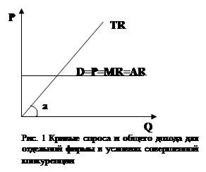 Наличие абсолютно эластичного спроса на продукцию фирмы принято называть критерием совершенной конкуренции. Как только на рынке складывается такая ситуация, фирма начинает вести себя как совершенный конкурент. Действительно, выполнение критерия совершенной конкуренции задает для фирмы многие условия деятельности на рынке, в частности определяет закономерности получения дохода. Доходом (выручкой) фирмы называют платежи, поступающие в ее пользу при реализации продукции. Как и многие другие показатели, экономическая наука подсчитывает доход в трех разновидностях. Общим доходом (ТR) называют всю сумму выручки, которую получает фирма. Средний доход (АR) отражает выручку в расчете на единицу реализованной продукции, или (что то же самое) общий доход, деленный на число реализованных продуктов. Наконец, предельный доход (МR) представляет собой дополнительный доход, полученный в результате продажи последней из реализованных единиц продукции. Прямым следствием выполнения критерия совершенной конкуренции является то, что средний доход при любом объеме выпуска равен одной и той же величине — цене товара и что на том же уровне всегда находится предельный доход. Скажем, если установившаяся на рынке цена батона равна 8 руб., то действующий как совершенный конкурент хлебный ларек принимает ее вне зависимости от объема продаж (выполняется критерий совершенной конкуренции). И 100, и 1000 батонов будут проданы по одинаковой цене за штуку. В этих условиях каждый дополнительно проданный батон принесет ларьку 8 руб. (предельный доход). И тот же объем выручки придется в среднем на каждый проданный батон (средний доход). Таким образом, устанавливается равенство между средним доходом, предельным доходом и ценой (АR=МR=Р). Поэтому кривая спроса на продукцию отдельного предприятия в условиях совершенной конкуренции является одновременно и кривой его средней и предельной выручки. Что касается общего дохода (общей выручки) предприятия, то он изменяется пропорционально изменению выпуска продукции и в том же самом направлении (см. рис. 1). То есть существует прямая, линейная зависимость: ТR=РQ. Если ларек в нашем примере продал 100 батонов по 8 руб., то его выручка, естетвенно, составит 800 руб. Графически кривая совокупного (валового) дохода - это луч, проведенный через начало координат с наклоном: tg a = DTR/DQ = MR = P. То есть наклон кривой валового дохода равен предельному доходу, который в свою очередь равен рыночной цене продукта, продаваемого конкурентной фирмой. Отсюда, в частности, следует, что чем выше цена, тем круче вверх пойдет прямая валового дохода. Цель всякой фирмы — максимизация прибыли. Прибыль (p) — это разница между совокупным доходом (ТR) и совокупными издержками (p) за период продаж: p = ТR - ТС = РQ - ТС. Легко заметить, что из трех переменных, находящихся в правой части равенства, главным рычагом управления объемом прибыли для фирмы является объем производства. Действительно, цена (Р) представляет собой в условиях совершенной конкуренции константу, т. е. не изменяется. Это внешнее условие деятельности фирмы, с которым надо считаться, а не фактор, которым можно управлять. Что касается издержек (ТС), то они сами во многом зависят от объема производства. Другими словами, в условиях совершенной конкуренции важнейшие решения фирмы связаны прежде всего с установ