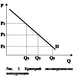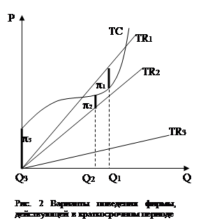 Легко видеть, что кривая валового дохода только в первом случае (ТR1) оказывается на определенном своем участке выше кривой валовых издержек (ТС). Именно в этом случае фирма будет получать прибыль, причем выберет тот уровень производства, где прибыль максимальна. Графически это будет та точка (Q1), где кривая TR1 будет выше кривой ТС на максимальное расстояние. Размер прибыли (p1) выделен на рис. 2 жирной линией. Во втором случае (ТR2) кривая дохода на всем своем протяжении находится ниже издержек, т. е. прибыли быть не может. Однако разрыв между обеими кривыми — а именно так графически отражается размер убытка — неодинаков. Вначале убытки значительны. Затем по мере роста производства они снижаются, достигая при выпуске Q2 единиц продукции своего минимума (p2). А потом начинают вновь расти. Очевидно, что выпуск Q2, единиц продукции в этих условиях оптимален для фирмы, так как обеспечивает ей минимизацию убытков. Наконец, в третьем случае разрыв между издержками и доходом (кривая TR3) с ростом производства только нарастает. Иными словами, убытки монотонно увеличиваются. В этой ситуации фирме лучше прекратить производство, смирившись с неизбежными в этом случае убытками в размере валовых постоянных издержек (p3). Однако прекращение производства не означает ликвидации самого предприятия (фирмы). Просто предприятие вынуждено временно остановить выпуск. Стоять оно будет до тех пор, пока рыночная цена не увеличится до такого уровня, что производство начнет приобретать какой-то смысл. Либо фирма убедится в долгосрочном характере понижения цены и окончательно прекратит свое существование. Примерами таких ситуаций являются временные остановки российских предприятий на несколько месяцев, а то и лет, что в годы реформ, к сожалению, не редкость. То прекращает производствоАЗЛК ( «Москвич» ), то ЗИЛ, а то и производитель казалось бы ходовых товаров — подмосковная фабрика «Марс», выпускающая шоколадные батончики. О бесчисленных же остановках малых предприятий на таком фоне и говорить не приходится. У временных остановок производства в России есть по сравнению с описываемыми в теории определенная специфика. А именно низкая цена, как правило, формально не является их причиной. Дело в том, что по нашему закону продажа продукции ниже себестоимости просто запрещена, т. е. не только ситуация Р < АVСmin, но и куда более мягкий случай АТСmin > Р > АVСmin никогда не может сложиться. Завод всегда назначает цену выше этого уровня. Но объективный закон экономики с помощью юридической нормы отменить нельзя. Когда реальная рыночная цена падает ниже себестоимости, продукцию предприятия по назначенной им более высокой цене перестают покупать. В этих условиях фирма обычно идет на скрытые формы, понижения цены. А именно соглашается на затяжку оплаты, принимает при бартерных сделках менее выгодные пропорции обмена своих изделий на другие товары и т.п. Главное же, на складе скапливается много непроданной продукции. Остановка предприятия в этих условиях позволяет сэкономить на переменных издержках (временно не платить зарплату, не закупать сырье и т.п.). А за это время дождаться поступления денег от своих должников и распродать излишки готовой продукции. До сих пор мы говорили о конкуренции исключительно как о положительном факторе, однако не стоит идеализировать рынок соверш