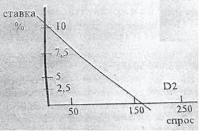 Рис.2. Спрос на деньги для сбережений (со стороны активов) D2. Спрос на деньги для сбережений (со стороны активов) зависит от процентной ставки. Чем выше процентная ставка, тем дороже обходится хранение денег в запасе, тем меньше спрос на деньги со стороны активов. Чем ниже процентная ставка, тем охотнее люди будут держать деньги в запасах как ликвидность.