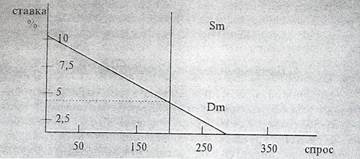 Рис.3. Общий спрос на деньги. Равновесная ставка процента. Dm – это общий спрос на деньги. Линию Dm получаем путем перемещения вправо линии D2 на величину спроса на D для сделок, то есть на 100. Пересечение спроса и предложения денег дает картину денежного рынка и определяет равновесную ставку процента. Выводы: 1. Чем больше предложение денег, тем меньше ставка процента и наоборот. Всем очевидно, что процентная ставка взаимосвязана с ценами на акции, облигации и т.д. От процентной ставки зависят капиталовложения, т.е. инвестиционная активность. 2. Денежное предложение можно менять с помощью определенных мер со стороны правительства. Правительство должно держать под контролем денежное предложение, то есть эмиссию как наличности, так и кредитную эмиссию, и управлять денежным предложением для достижения определенных целей. Рассмотрим подробнее последствия изменения предложения денег и изменения процентной ставки. На денежном рынке, где сталкиваются спрос и предложение, спрос является величиной относительно устойчивой и предопределенной стоимостью валового национального продукта (в части спроса на деньги для сделок) и процентной ставкой (в части спроса на деньги со стороны активов). А денежное предложение можно изменять путем проведения определенной политики со стороны Правительства и Центрального банка. Изменение денежного предложения имеет определенные последствия. Допустим, на денежном рынке установилось на данный момент временное равновесие, люди имеют на руках столько денег, сколько соответствует их спросу (желанию), предопределенному вышеописанными факторами. Можно сказать, что денег было пущено в обращение столько, сколько соответствовало спросу. Теперь представим, что предложение денег увеличилось. «Если люди были удовлетворены размеров своих денежных запасов, а общая денежная масса возросла, то со временем люди обнаружат, что у них скопилось слишком много денег, и постараются сократить свои фактические денежные запасы до желаемого уровня» (Хейне). Изменять денежные запасы они будут, меняя структуру своих активов, например, покупая акции корпораций или государственные облигации. Увеличение денежного предложения повысит спрос на все другие виды активов – финансовых активов и товаров. Это приведет к росту цен на товары, росту цен на облигации, акции и к снижению рыночной процентной ставки за использование денег. Структура активов будет меняться до тех пор, пока предельная выгодность всех видов будет одинакова. Если денег в обращение выпущено меньше, чем спрос на них (желание иметь деньги в запасах), то люди попытаются опять же изменить структуру активов. Они будут пытаться сократить свои покупки, что приведет к снижению цен на товары. Они будут также продавать недвижимость, акции, облигации, что приведет к снижению их рыночных цен. Это процесс будет продолжаться до тех пор, пока предельная выгодность всех активов будет одинакова. Процентная ставка за использование денег будет в этом случае расти. Таким образом, воздействуя на количество денежного предложения, можно влиять на многие процессы, поскольку изменение объема денежной массы влияет на состояние экономики в целом. Знание показанных зависимостей лежит в основе монетарной политики. ЗАКЛЮЧЕНИЕ