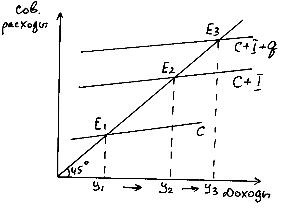 С – потребление населенияУ1 – равновесный объем ВНП, при условии, что совокупные расходы представлены только потребительскими расходами. Если население предъявляет больший спрос на товары и услуги, то предприятия расходуют больше средств на факторы производства, т.е. увеличиваются инвестиции У2 – равновесный объем ВНП при C + I. При несовершенной рыночной экономике, государство тоже предъявляет спрос на товары и услуги, следовательно, ВНП увеличивается У3 – равновесный объем ВНП при C + I + Q. Воздействие инвестиций на объем ВНП обладают мультипликаторным или множительным эффектом, т.е. вызывается вторичный и третичный рост доходов. При однократном увеличении инвестиций происходит увеличение спроса на факторы производства, в т.ч. рост занятости, т.е. рост доходов населения занятых в этой отрасли или сфере. Рост этих доходов вызывает рост вторичного спроса и, следовательно, к росту вторичной занятости, что приводит к росту третичных доходов. Под мультипликатором инвестиций понимается коэффициент, отражающий величину прироста ВНП от воздействия прироста инвестиций. У Ki = -------------I MPC=0.75