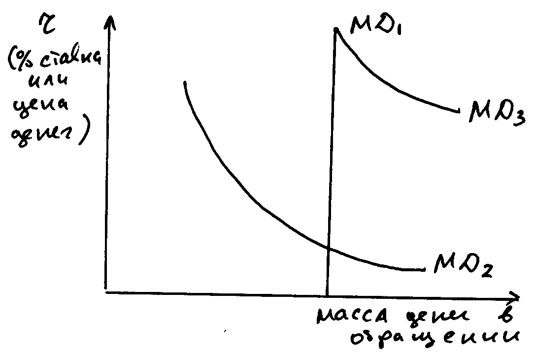 МД1 - трансакционный спрос на деньгиМД2 – спекулятивный спрос на деньги – от находиться в обратной зависимости от ставки процента МД3 – общий спрос на деньги – никогда не пересекает оси ординат, поскольку процентная ставка в рамках рынка не может быть 0; даже при очень высоких ставках процента существует спрос на деньги для сделок