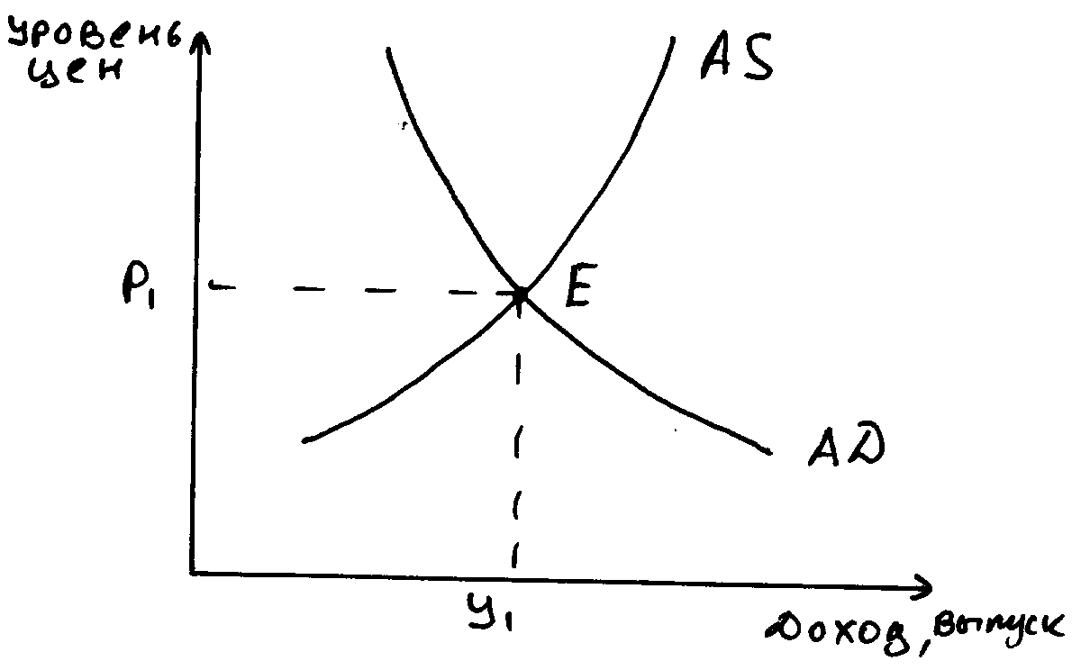 Равенство совокупного спроса и совокупного предложения (AD-AS). Модель показывает формирование равновесного уровня цен при данном совокупном спросе и совокупном предложении.