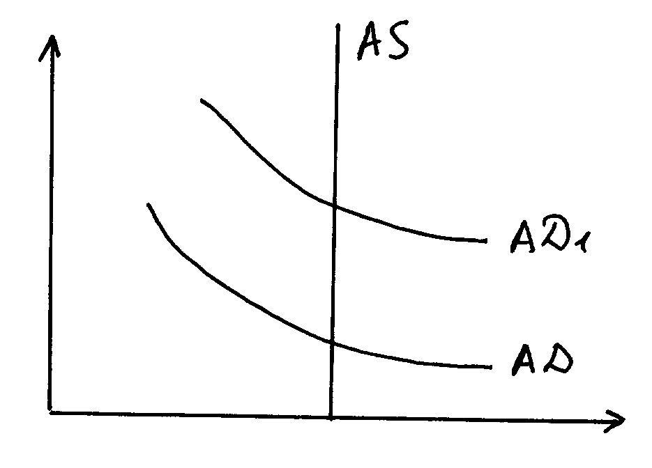 МЭР в точке пересечения AD и AS показывает равновесный объем ВНП, который равен потенциальному объему ВНП. Графическое отображение кривой AS по-разному представляют различные экономические школы. Классическая и Кейнсианская экономические школы по разному относятся к определению «потенциальный объем ВНП». Классическая школа считает, что рыночная экономика является саморегулирующейся системой, т.е. МЭР обеспечивается автоматически, при этом все цены, в т.ч. затратные факторные цены свободно меняются. При увеличении совокупного спроса первоначально происходит увеличение объема производства, однако за тем растут факторные цены. В результате дальнейший рост производства становиться нецелесообразным. Объем ВНП возвращается к первоначальному потенциальному уровню. Классическая школа базируется на утверждении, что спрос рождает предложение, но в кратковременной перспективе. В долгосрочном периоде это утверждение не действует, предложение возвращается к первоначальному уровню, кривая совокупного предложения для классической школы представляется вертикальной прямой. Любое вмешательство государства приводит к росту цен.