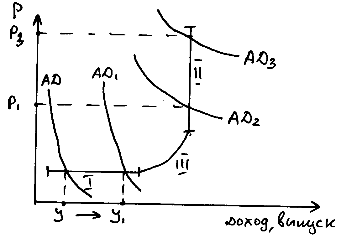 I – Кейнсианский отрезок совокупного предложения – или совокупное предложение вкраткосрочном периодеII – Классический отрезок совокупного предложения – или совокупное предложение в долгосрочном периоде III – Среднесрочный период – при котором увеличение совокупного спроса приводит и к экономическому росту и росту цен
