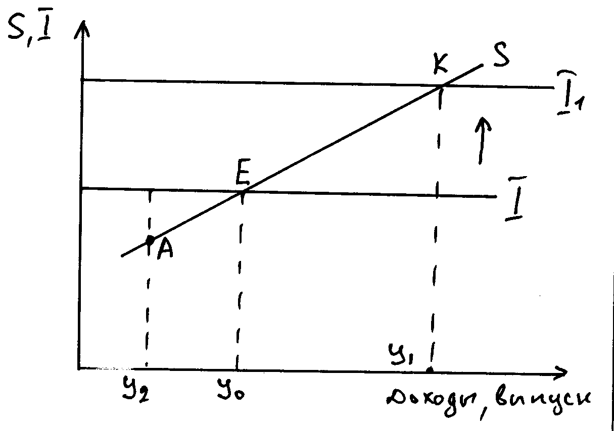 СХЕМА А. В точке Е достигается МЭР, при котором инвестиции равны сбережениям, У0 – равновесный объем ВНП. СХЕМА В. Сбережения больше инвестиций, потребители воздерживаются от потребления, растут товарные запасы, выпуск сокращается. При сокращении объема выпуска, доходы сокращаются, следовательно сбережения также сокращаются. СХЕМА С. В точке А все наоборот. В рассматриваемых выше вариантах не учитывалась проблема полной занятости населения, т.е. не рассматривался потенциальный объем ВНП. Предположим что потенциальный объем ВНП равен У1. Государство должно увеличить инвестиции II 1.