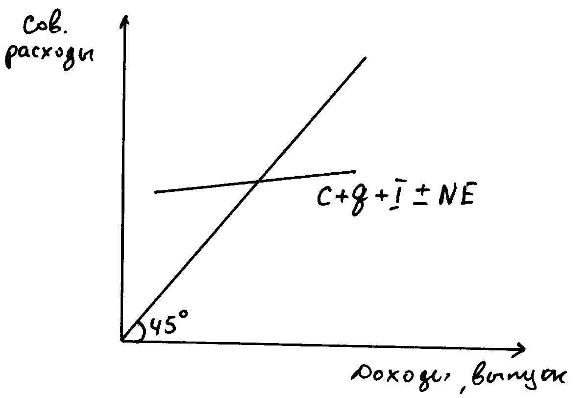 Модель «Кейнсианский крест» (модель «расходы – доходы»). Показывает формирование равновесного ВНП при равенстве совокупных доходов и совокупных расходов. Основная идея – планируемые расходы – совокупные расходы, - должны быть равны национальному продукту.