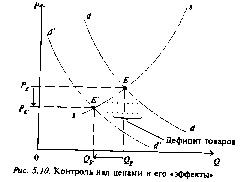 Направления движения цены и объемы производства товаров показаны стрелками вдоль соответствующих осей графика. Налог платит непосредственно производитель или продавец товаров, однако большая его часть перекладывается на потребителей, покупающих облагаемые налогом товары. Размер уплачиваемого государству налога равняется заштрихованному на графике участку. Это вычет из торговой выручки продавца и одновременно вычет из личных доходов потребителей, покупающих облагаемые налогом товары. Но главный отрицательный эффект налогообложения – общее снижение производства товаров и недопотребление их покупателями, для которых этот товар оказался недоступным. Контроль над ценами Контроль над ценами осуществляет государство на законодательной основе. Но он имеет вид вмешательства, нарушающего механизм рыночного ценообразования по законам спроса и предложения. Подобное вмешательство способны осуществлять и любые другие монопольные структуры. В любом случае вмешательства такого рода способны блокировать рыночный механизм конкурентного ценообразования. Государственное вмешательство в рыночное ценообразование чаще всего сводится к принудительному установлению цены на уровне ниже рыночного равновесия спроса и предложения. Последствия контроля над ценами могут быть многообразными, но все они, в особенности при длительном их применении, как правило, имеют отрицательный эффект в социальной и экономической сфере. Такие последствия обнаружатся в товарном дефиците, нехватке и недопроизводстве товаров, что отрицательно скажется на всем обществе. Контроль над ценами приводит также к таким экономическим последствиям, как сокращение производства, возникновение теневой экономики в различных сферах.