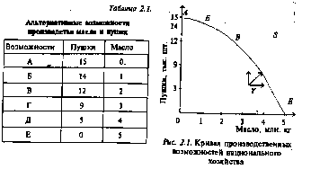 Ограниченность ресурсов диктует необходимость выбора оптимума производственных ценностей и самого процесса производства, базируясь на принципах комбинации, замещения факторов с учетом эффекта масштаба производства и закона падающей производительности. Уровень потребности определяется уровнем технического развития и развития общества в целом. Проблема между безграничностью потребностей и ограниченностью ресурсов – может графически быть представлена в виде кривой производственной возможностей. Таблица 2.1. Рисунок 2.1.