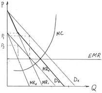 Условие определения дискриминационных цен: MR1=MR2=MRT=MC EMR − линия равной предельной выручки Выводы: 1) При ED(P)1 (1-го рынка) > ED(P)2, P1 должна быть меньше, чем P2. Самая низкая цена будет на том рынке, где самая высокая эластичность. 2) При ED(P)1 < ED(P)2, P1 > P2. 3) Если эластичность одинаковая, то ценовая дискриминация невозможна: P1 = P2. Условия ценовой дискриминации (для исключения перепродаж) 1) Препятствия при передвижении товара с одного рынка на другой (таможенные барьеры). 2) Отдаленность рынка. 3) Специфика продукта. 4) Разделение рынков по качеству (также: мнимое качество). В условиях монополии появляется возможность использовать стратегии дискриминации цен по всем ее видам. ОСОБЕННОСТИ ЦЕНООБРАЗОВАНИЯ В УСЛОВИЯХ МОНОПОЛИСТИЧЕСКОЙ КОНКУРЕНЦИИ 1. Характеристики рынка монополистической конкуренции. 2. Условия равновесия и определения цены. 3. Влияние рекламы на цены и прибыль. 4. Стратегии ценообразования на рынках монополистической конкуренции. 1. Характеристики: · достаточное высокое количество фирм (продавцов), доля каждого около 1%; · товар каждой фирмы является несовершенным заменителем товара другой фирмы => дифференцированные товары; · продавцы не считаются с реакцией соперников на цены и количество выпускаемого товара; · вход и выход на рынок относительно свободный, трудности возникают в основном в связи с торговыми марками, присутствующими на рынке; · очень сильна неценовая конкуренция; · действие эффекта масштаба незначительно. |