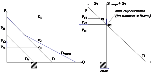 Распределение последствий от налога между потребителем и производителем зависит от угла наклона кривой спроса и кривой предложения. 2) Влияние дотаций на излишки потребителя и производителя