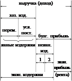 Неявные издержки: 1) норма дохода на капитал; 2) нормальный доход. Экономическая прибыль − это та прибыль, которая обусловлена предпринимательским выбором, и от которой владельцы не отказываются, а используют ее, а это и есть сверхприбыль (рента). Нормальная прибыль − это та прибыль, от которой владельцы отказываются, используя собственные ресурсы в своей фирме, но которую можно было бы получить, вложив свои ресурсы в иное дело. Экономическая прибыль = выручка (доход) − экон. издержки Экономические издержки = явн. издержки + неявн. издержки