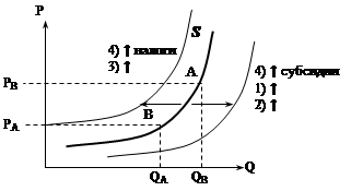 Кривая совокупного предложения Факторы: 1) количество производителей на данном рынке (если больше − вправо); 2) технология производства; 3) цена экономических ресурсов; 4) налоги и субсидии; 5) природно-климатические условия.