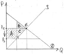увеличился на величину, равную площади А (т.к. ниже P). Потребитель потерял