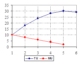 Тема 4. ЦЕНА И ПОЛЕЗНОСТЬ ТОВАРОВ 1. Полезность товара и ее показатели. Количественная и порядковая полезность, предельная и общая. 2. Закон убывающей предельной полезности и его виляние на цены. 3. Потребительский оптимум и его определение при количественном измерении полезности 1. В соответствии с тем, какой способ измерения используется, существуют теории: кардиналистический подход (количественное измерение полезности), ординалистический подход (порядковое измерение). Первый основывается на введении искусственных условных единиц − ютилей (от сл. ulitity). Второй подход использует соотношение товаров. Происходит упорядочивание набора товаров по предпочтительности. Математический подход к порядковому способу: он базируется на аксиомах о свойствах отношений предпочтения и безразличия: 1) сравнимость наборов: хуже (<), лучше (>), все равно, безразлично (=); 2) транзитивность отношений: если х1>х2, х2>х3 => х1>х3; 3) ненасыщенность: > лучше, чем <. Общая и предельная полезность Общая (совокупная) полезность TU (total utility) − суммарная полезность, которую получает потребитель от использования всех купленных единиц товара. Предельная полезность MU (margin utility) − дополнительная полезность, которую получит потребитель при использовании одной дополнительной единицы товара.
