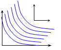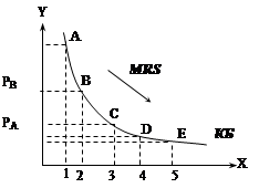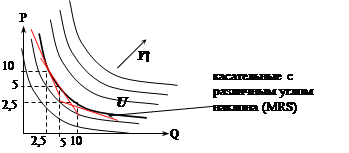 Кривая безразличия представляет собой совокупность (геометрическое место) точек, каждая из которых показывает, какое сочетание товаров А и В обеспечит покупателю одну и ту же полезность. Задача потребительского выбора заключается в том, чтобы максимизировать функцию полезности при ограничениях (доход и цены). Кривая безразличия − линия равной полезности наборов товаров. Карта кривых безразличия представляет собой совокупность кривых безразличия и дает представление о системе предпочтений потребителя. Кривая безразличия характеризуется несколькими свойствами: 1) кривые имеют отрицательный наклон; 2) две кривых безразличия не пересекаются; 3) кривая безразличия может быть проведена через каждую точку в пространстве товаров; 4) кривые безразличия выпуклы по отношению к началу координат; 5) предельная норма замены одного товара другим уменьшается при движении вдоль кривой безразличия вниз. 2. Норма замещения товара х товаром у RS (rate of substitution) − количество товара у, которое потребитель готов уступить в обмен на увеличение товара х на единицу с тем, чтобы общий уровень удовлетворения остался неизменным. {«−”, т.к. отказывается} Предельная норма замещения: