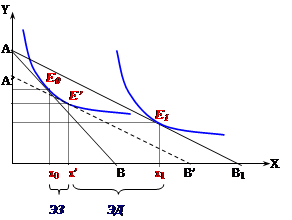 xx′ − эффект замены x′x1 − эффект дохода