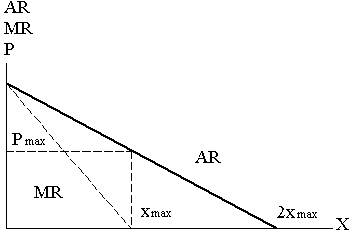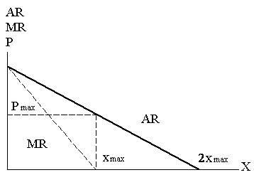 АR = р = а - bx (1.1) График 1.1. Максимальная выручка полной монополии. Известно также, что выручка складывается из цены, помноженной на количество проданного товара, т.е. TR = рx. Подставляя формулу АR в формулу TR, получаем: TR= рх = ах –bх2 (1.2) или МR=dTR/dх = а-2bх (1.3) Иначе говоря, кривая предельной выручки имеет отрицательный наклон, вдвое более крутой, чем кривая спроса, и пересекает нулевую горизонтальную ось вдвое быстрее, а именно в точке хmax. Этой точке соответствует цена рmax . В ней реализуется максимальная выручка. Но это еще не максимальная прибыль. Чтобы выяснить условия ее образования, добавим в график кривые общих издержек АТС, средних переменных издержек АVС и