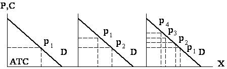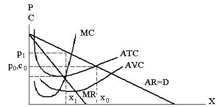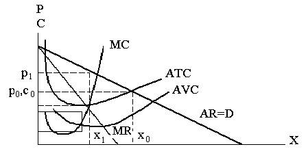 дельных издержек МС. График 1.2. Максимальная прибыль полной монополии Разумеется, прибыль образуется только тогда, когда цена превышает средние полные издержки (р>АТС), что соответствует точке пересечения кривых полных издержек и спроса. При совершенной конкуренции именно в этой точке образуется рыночное равновесие, т.е. равновесной цене р0 соответствует равновесное предложение x0. При совершенной конкуренции фирма, как правило, не может получить цену большую, чем равновесная. Монополия же имеет такую возможность, причем образуется целая зона (от x0 до х1), где реализуется монопольная сверхприбыль. Но сверхприбыль — это еще не максимальная прибыль. Последняя образуется только при выпуске х1, и при цене р1, т.е. когда предельная выручка МR равна предельным издержкам МС. Математически это доказывается следующим образом: P= TR - TC =TR (х) -TC (х) (1.4) Необходимое условие[1]: dР/dх = dТR/dх - dТС/d1х = МR - МС = О (1.5) или MR=MC (1.6) Всякое изменение объема в ту или иную сторону приводит к сокращению монопольной прибыли. Обратите внимание, что для обеспечения максимальной прибыли требуется меньший объем предложения и более высокая цена, чем для обеспечения максимальной выручки. Разумеется, это не означает, что всякая монополия на практике действует в строгом соответствия с этими правилами. Но она имеет возможность для извлечения максимальной сверхприбыли и при прочих равных условиях будет стремиться к этому. Сравним монопольную ситуацию с совершенной конкуренцией. Во-первых, очевидно, что монополия не руководствуется кривой издержек для определения оптимальной точки производства. Точка максимальной прибыли зависит всецело от положения кривой спроса. Если растет спрос, то увеличиваются как объем продукции, так и цена, даже если издержки при этом сокращаются. Отсюда следует второй важный вывод: у монополии, в отличие от фирм, при совершенной конкуренции нет необходимости производить продукцию по наинизшим издержкам, т.е. использование ею ресурсов не обязательно является наиболее эффективным[2]. Третий вывод также весьма важен: монополия реализует свою продукцию по цене, которая заведомо превышает равновесную цену при свободной конкуренции, и производит всегда меньше, чем фирма в условиях такой конкуренции. Таким образом, монополия ведет к потерям количества товара и накладывает на покупателя дополнительное бремя в виде более высоких цен. Вместе с тем сверхприбыль монополии позволяет ей расходовать средства на более точное прогнозирование спроса, использование более широкого варианта технических средств производства, заранее определять наиболее выгодные сочетания цен, издержек, загрузки мощностей и т.д. Монополия, в отличие от мелкого предпринимателя работает на заведомо известный рынок, который ей в значительной мере подконтролен, и потому намного меньше рискует. При таких условиях использование критерия максимизации прибыли становится намного более реальным, чем для небольших конкурирующих между собой фирм. Эти и другие преимущества монополии позволяют ей, как правило, подавлять потенциальных конкурентов, грозящих нарушить ее монопольное положение, и главное — не допускать их на свой рынок. Препятствия для входа на рынок — обязательное условие существования монополии. Они могут быть естественными и искусственно созданными. Наиболее важ