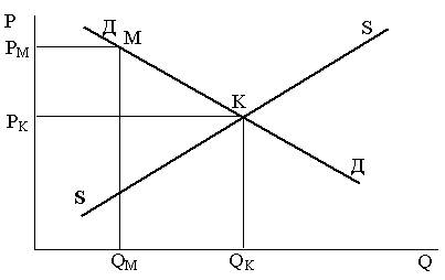 Рис.1. Модель рыночного равновесия и установления монопольно высокой цены. покупатели еще согласны отдать за приобретение товара (при данной величине предложения). Важно отметить, что выше цены спроса рыночная цена товара подняться не может, так как у покупателей не хватит денег, чтобы расплатиться с продавцом. Поведение производителя (продавца) на рынке подчиняется закону предложения 2, который графически изображается кривой предложения S-S. Каждая точка кривой предложения иллюстрирует прямую зависимость между ценой предложения и количеством товара, предлагаемым производителями (продавцами) на рынке. Цена предложения это предельная (минимальная) цена, за которую производители (продавцы) еще согласны продавать свой товар (при данной величине спроса). Ниже этой минимальной цены рыночная цена снизиться уже не может, так как это сделает продажу товара экономически нецелесообразной. Рыночная (равновесная) цена — это та цена, которая одновременно устраивает и продавцов, и покупателей. Ситуация рыночного равновесия наступает тогда, когда: 1) величина предложения совпадает с величиной спроса; 2) цена спроса равняется цене предложения. Графически рыночное равновесие определяется точкой пересечения кривых спроса Д-Д и предложения S-S. В условиях свободной конкуренции рыночная (равновесная) цена является конкурентной. Свободная конкуренция предполагает такое (достаточно) большое количество продавцов и покупателей, чтобы ни один из них не мог оказать существенное влияние на уровень рыночной цены. Важно отметить, что кривые спроса Д-Д и предложения S-S складываются соответственно из кривых спроса и кривых предложения отдельных хозяйствующих субъектов. При монополизации рынка ситуация существенно изменяется. В случае «чистой» монополии на рынке есть одна фирма-производитель (продавец), или все фирмы-производители (продавцы) слились в одну (образовали холдинг) под единым организационным или финансовым контролем, или между производителями (продавцами) существует ценовой сговор. В этой ситуации монополист может выбрать на кривой спроса любую, наиболее выгодную для него точку (вполне возможно, чисто эмпирическим путем через ряд итераций), такую комбинацию параметров (цена Рм — объем продаж Qм), которая обеспечит ему максимальную реализацию его рыночной стратегии. Здесь возможны три ситуации: 1) Монополист, злоупотребляя своим доминирующим положением на рынке, устанавливает другую, более высокую (по сравнению с конкурентной) цену. При этом более высокой цене соответствует сократившийся объем производства и, как правило, возросший размер прибыли монополиста (на рис. 1 это точка М). Такие действия в юридических терминах ст. 5 Закона РФ «О конкуренции...» называются изъятием товаров из обращения с целью повышения цен. Цена, ущемляющая интересы потребителей, называется для краткости (ввиду отсутствия этого понятия в Законе) монопольно высокой ценой (п. 2.4 Рекомендаций). 2) Противоположная ситуация — предприятие, монопольно хозяйничающее на рынке, снижает цены с целью ограничения конкуренции. Юридически это трактуется как создание препятствий доступу на рынок другим хозяйствующим субъектам, а в Рекомендациях — как установление монопольно низких цен (п. 2.5). Разновидностью монопольно низкой цены является монополистически низкая цена. Дл