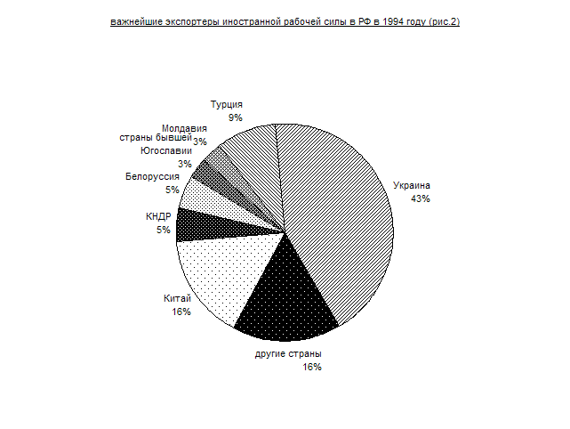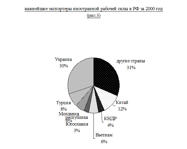 Направления миграции иностранной рабочей силы. В 2000 году иностранная рабочая сила в РФ прибывала из 116 стран мира, половина из которых представлена странами Азии и Африканского континента. Круг основных государств, направляющих иностранную рабочую силу в Россию, сформировался еще в первой половине 90-х годов. Безусловным лидером среди этих стран является Украина. Можно также утверждать, что основная масса нелегальных трудовых мигрантов прибывает в Россию также с Украины. Среди бывших союзных республик, из которых в Россию направлены важнейшие потоки трудовой миграции, выделяется также Молдавия. Все большую роль на внутреннем российском рынке труда играет рабочая сила из Таджикистана, Армении, Грузии, Азербайджана (табл.3) Страны СНГ с наибольшим экспортом рабочей силы в Россию (табл.2).