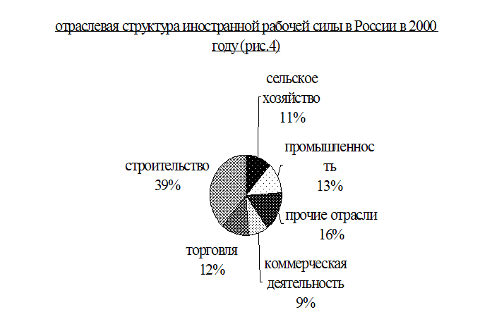 Распределение иностранных рабочих по отраслям экономики весьма дифференцировано. Так, преобладающая часть трудовых мигрантов с Украины сосредоточена в строительстве, промышленности и сельском хозяйстве. Строительные и ремонтные фирмы, особенно небольшие и расположенные в крупных городах, чаще всего используют рабочую силу не только с Украины, но и из Молдавии. Среди трудовых мигрантов из республик Закавказья довольно велико число занятых в торгово-коммерческой сфере. Так, в потоке трудовых мигрантов из Азербайджана каждый пятый занимается торговлей. Потоки трудовой миграции из стран дальнего зарубежья также направляются в основном в строительство. Основные зарубежные государства-экспортеры строительных рабочих – Турция, Югославия и Болгария. Вместе с тем значительная часть мигрантов из Вьетнама, Афганистана, Индии, Бангладеш, Китая сосредоточена в торгово-коммерческой деятельности. При этом китайские и корейские граждане намного чаще, чем представители других государств, работают в сельском хозяйстве. Характерно, что мигранты, занятые в «элитарных» сферах (общей коммерческой деятельности, кредитовании и финансовой сфере), в основной массе (на 80-90%) прибывают в Россию из дальнего зарубежья. Между регионами, принимающими иностранных работников, имеются существенные различия в структуре их занятости. Так, в Приморском крае самый большой удельный вес занятых иностранных работников приходится на торговлю, коммерцию и общественное питание, в Свердловской области – на общую коммерческую деятельность по обеспечению рынка, в Волгоградской области – на сельское хозяйство, в Иркутской области – на геологию и горнодобывающую промышленность, золотодобывающие артели. В Москве и Московской области около половины иностранцев работают в строительстве, примерно каждый пятый – в торговле. Профессионально-квалификационный состав иностранных работников также имеет свои особенности. Анализ разрешений на привлечение иностранных работников показывает, что мигранты приглашаются более чем по 100 специальностям. В составе иностранных работников преобладают лица со средним или низким уровнем квалификации. Среди них доминируют строители, занятые на силовых установках и в металлообработке, рабочие шахт, буровых скважин, водители, работники сельского хозяйства. Трудовая миграция из бывших союзных республик охватывает преимущественно профессиональные группы строителей и рабочих, причем доля строителей превышает треть. Второе место у рабочих, занятых в металлообработке(15%). Третье место принадлежит рабочим, занятым на силовых установках (мотористы, электрики, электромонтеры и др.) – 14%. В профессиональной структуре рабочей силы из дальнего зарубежья преобладают строители и овощеводы. Основная часть строителей прибывает из Китая. Они работают в восточных регионах России. Строители из европейских стран (прежде всего из Польши, Германии, Финляндии, Югославии, Болгарии), а также из Турции заняты главным образом в европейских районах, прежде всего в Москве и Санкт-Петербурге. Большинство овощеводов прибывает из Китая – более 90% их общего числа. Из развитых европейских стран (Бельгия, Франция, Великобритания), а также из Японии, Канады и США прибывают в основном специалисты: журналисты, преподаватели, инженерно-технические работ