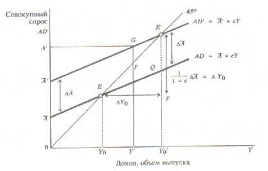 Исследование мультипликатора в этом уравнении показывает, что чем больше величина предельной склонности к потреблению, тем больше и сам мультипликатор. При предельной склонности к потреблению, равной 0,6, как в таблице, мультипликатор равен 2,5; при предельной склонности к потреблению 0,8 мультипликатор равен уже 5. Причина проста: высокая предельная склонность к потреблению означает, что на потребление будет расходоваться значительная часть прироста дохода, следовательно, соответственно будет увеличиваться совокупный спрос. Точно так же значительными будут закупки, обусловленные приростом автономных расходов, и существенным расширение выпуска и дохода, необходимого для восстановления равенства между доходом и спросом (или расходами). Обратим внимание, что соотношение между предельной склонностью к потреблению с и предельной склонностью к сбережению s позволяет нам записать уравнение в несколько другом виде. Из бюджетного ограничения следует, что сбережения в сумме с потреблением равняются доходу. Так что часть доллара добавочного дохода, идущая на потребление, и часть, идущая на сбережение, в сумме составляют ровно 1 доллар, или 1=s+с. Подставив s=1-c в уравнение, получим эквивалентное выражение мультипликатора через предельную склонность к сбережению: α≡1/s. Мультипликатор на графикеНа рисунке дается графическая интерпретация воздействия прироста автономных расходов на равновесный уровень дохода. Первоначально равновесие достигалось в точке Е при уровне дохода Y0. Теперь автономные расходы возросли с А до А'. Это показано на графике параллельным смещением вверх линии совокупного спроса до положения AD'. Смещение вверх означает, что теперь при любом уровне дохода совокупный спрос становится больше на величину ∆Ā≡ Ā'-Ā. Теперь совокупный спрос превышает первоначальный уровень дохода (или выпуска) Y0. В результате происходит незапланированное снижение запасов на величину, равную приросту автономных расходов, т.е. расстоянию ∆Ā по вертикали. Фирмы отреагируют на появление избыточного спроса расширением производства, скажем, до уровня Y'.