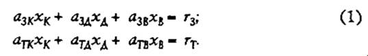 Уравнения общего равновесия. Немного поразмыслив, мы можем записать основные зависимости нашей островной экономики в виде уравнений. Возьмем сперва ограничения по ресурсам. Очевидно, что количество каждого ресурса, которое используется в производстве кукурузы, дров и виски, не может не быть равно в сумме тому количеству этого ресурса, каким располагает наше хозяйство. Поэтому: