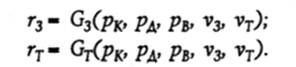 Сейчас возьмемся за цены. Всего их у нас 5 (цены трех продуктов + цены двух ресурсов). Цены служат аргументами функций спроса. Мы здесь имеем дело не с обычной кривой спроса, потому что мы теперь знаем, что спрос на каждый отдельный товар зависит (так или иначе) от цен на все товары и ресурсы в экономике. Как зависит? Пока это неважно, потому что мы пока не собираемся заниматься вычислениями. Поэтому мы просто констатируем, что спрос на данный товар есть какая-то функция от всех цен (функция типа F). И потому мы можем записать систему из трех уравнений спроса (по трем продуктам):