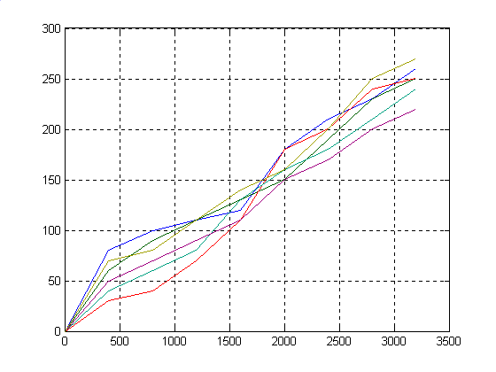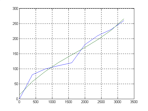 S = R: [4x4 double] df: 5 normr: 43.1607 z = Columns 1 through 7 13.5354 57.1717 91.9986 120.6926 145.9307 170.3896 196.7460 Columns 8 through 9 227.6768 265.8586 Командой plot произвели построение исходной функции (синий цвет) и функции аппроксимирующей её (зелёный цвет). Поскольку велико значение погрешности normr=43.1607 и недостаточно аппроксимирование, то следует повысить степень полинома. Пусть вместо 3 будет 6. Программа. %Исходные данные x=[0 400 800 1200 1600 2000 2400 2800 3200]; f=[0 80 100 110 120 180 210 230 260]; %a - коэффициенты полинома %S - квадратичная погрешность [a,S]=polyfit(x,f,6) z=polyval(a,x) %Построение графиков plot(x,f,x,z),grid Результат. a = 0.0000 -0.0000 0.0000 -0.0000 -0.0002 0.2770 0.0140
