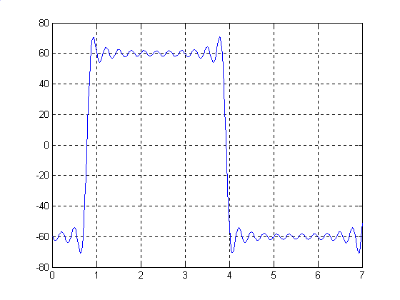 Программа. F=[]; for k=1:2:21; Im=60; wt=0:0.02:7; i=(4*Im/pi)*((1/k)*sin(k*(wt-pi/4))); F=[F i']; end F1=F'; d=size(F1); d(1); F2=sum(F1); plot(wt,F2,'b'),grid