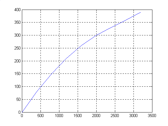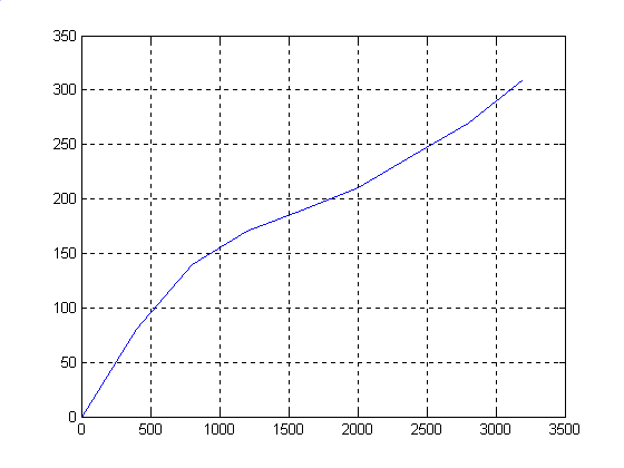 Программа. %Исходные данные x=[0 400 800 1200 1600 2000 2400 2800 3200]; f=[0 80 100 110 120 180 210 230 260]; %a - коэффициенты полинома %S - квадратичная погрешность [a,S]=polyfit(x,f,3) z=polyval(a,x) %Построение графиков plot(x,f,x,z),grid Результат. a = 0.0000 -0.0000 0.1223 13.5354