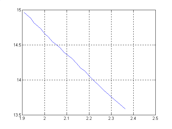 Вывод. Таким образом получена оптимальная зависимость распределения груза с наибольшим доходом от перевозки. Для наглядности по полученным значениям построен график. Оптимизация режима движения суднаЦель работы. Распределить скорость движения судна по четырём участкам трассы так, чтобы суммарный расход топлива был минимальным. Программа. %Подготовка исходных данных delt=0.07; tmin=[5.86 2.73 1.6 3.3967]; tmax=[7.47 3.71 2.37 4.5167]; t=[tmin; tmax]; tb=[tmax-tmin]; G1=[967.42 941.39 912 892.29 878.02 846.11 823.73 798.51 775.22 ... 764.2 741.28 719.36 706.85 678.15 673.74 659.91 645.65 ... 630.98 623 610.9 598.95 590.07 577.2 571.46]; G2=[521.73 491.12 463.51 437.33 415.2 392.7 377.45 358.23 346.86 ... 328.98 316.25 305.38 295.48 285.86 277.11]; G3=[281.47 255.5 231.07 210.41 192.31 177.55 166.97 157.77 ... 149.86 144.48 140.91 139.23]; G4=[590.60 561.90 535.10 510.20 487.06 465.67 445.94 427.82 ... 411.23 396.12 382.42 370.06 358.99 349.13 340.42 332.80 325.41]; %Формирование векторов t1, t2, t3, t4 t1=t(1,1):delt:t(2,1); t2=t(1,2):delt:t(2,2); t3=t(1,3):delt:t(2,3); t4=t(1,4):delt:t(2,4); %Пригонка данных [a1,H1]=polyfit(t1,G1,3); [a2,H2]=polyfit(t2,G2,3); [a3,H3]=polyfit(t3,G3,3); [a4,H4]=polyfit(t4,G4,3); a=[a1;a2;a3;a4]; %Апроксимация исходных зависимостей N=25; deltM=tb./(N-1); %Моделирование TM=[];Gm=[]; for i=1:4; tm=t(1,i):deltM(i):t(2,i); TM=[TM;tm]; gm=polyval(a(i,:),tm); Gm=[Gm;gm]; end deltt=deltM; %Оптимизация распределения времени движения GG=[]; F=Gm; for xr=1:N; I=1:xr; L=Gm(1,I)+Gm(2,xr-I+1); [Lopt,I]=min(L); X1=5.86+I*deltt(1)-deltt(1); X2=2.73+(xr-I)*deltt(2); Pacn=[Lopt.*0.001;X1;X2;X1+X2]; GG=[GG Pacn]; end D=GG(1,:); C=GG(4,:); PP=[];RRR=[]; for J=2:3; DD=[];RR=[];CC=[]; for xr=1:N; I=1:xr; L=D(I)+0.001.*F(J+1,xr-I+1); [Lopt,I]=min(L); X1=C(I); X2=TM(J+1,1)+(xr-I)*deltt(J+1); Pacn=[Lopt;X1;X2;X1+X2]; DD=[DD Pacn(1,:)]; RR=[RR Pacn]; CC=[CC Pacn(4,:)]; end PP=[PP;DD(1,:)]; RRR=[RRR RR]; D=DD; C=CC; end RRR=[GG RRR]; R12=RRR(:,1:N) R23=RRR(:,N+1:2*N) R34=RRR(:,2*N+1:3*N) plot(R34(1,:),R34(4,:)),grid Результат. R12 = Columns 1 through 7 1.4899 1.4647 1.4402 1.4164 1.3934 1.3710 1.3494 5.8600 5.9271 5.9942 6.0613 6.1283 6.1954 6.2625 2.7300 2.7300 2.7300 2.7300 2.7300 2.7300 2.7300 8.5900 8.6571 8.7242 8.7912 8.8583 8.9254 8.9925 Columns 8 through 14 1.3285 1.3083 1.2889 1.2703 1.2522 1.2343 1.2172 6.3296 6.3967 6.4638 6.5308 6.5308 6.5979 6.5979 2.7300 2.7300 2.7300 2.7300 2.7708 2.7708 2.8117 9.0596 9.1267 9.1937 9.2608 9.3017 9.3688 9.4096 Columns 15 through 21 1.2001 1.1838 1.1675 1.1521 1.1367 1.1220 1.1075 6.6650 6.7321 6.7321 6.7992 6.7992 6.8663 6.8663 2.8117 2.8117 2.8525 2.8525 2.8933 2.8933 2.9342 9.4767 9.5437 9.5846 9.6517 9.6925 9.7596 9.8004 Columns 22 through 25 1.0936 1.0799 1.0668 1.0538 6.9333 6.9333 7.0004 7.0004 2.9342 2.9750 2.9750 3.0158 9.8675 9.9083 9.9754 10.0162 R23 = Columns 1 through 7 1.7720 1.7468 1.7223 1.6985 1.6754 1.6530 1.6314 8.5900 8.6571 8.7242 8.7912 8.8583 8.9254 8.9925 1.6000 1.6000 1.6000 1.6000 1.6000 1.6000 1.6000 10.1900 10.2571 10.3242 10.3912 10.4583 10.5254 10.5925 Columns 8 through 14 1.6105 1.5904 1.5710 1.5523 1.5342 1.5164 1.4992 9.0596 9.1267 9.1937 9.2608 9.3017 9.3688 9.4096 1.6000 1.6000 1.6000 1.6000 1.6000 1.6000 1.6000 10.6596 10.7267 10.7937 10.8608 10.9017 10.9688 11.0096 Columns 15 through 21 1.4821 1.4658 1.4496 1.4341 1.4187 1.4040 1.3895 9.4767 9.5437 9.5846 9.6517 9.6925 9.7596 9.8004 1.6000 1.6000 1.6000 1.6000 1.6000 1.6000 1.6000 11.0767 11.1437 11.1846 11.2517 11.2925 11.3596 11.4004 Columns 22 through 25 1.3756 1.3619 1.3488 1.3358 9.8675 9.9083 9.9754 9.9754 1.6000 1.6000 1.6000 1.6321 11.4675 11.5083 11.5754 11.6075 R34 = Columns 1 through 7 2.3626 2.3374 2.3129 2.2892 2.2661 2.2437 2.2221 10.1900 10.2571 10.3242 10.3912 10.4583 10.5254 10.5925 3.3967 3.3967 3.3967 3.3967 3.3967 3.3967 3.3967 13.5867 13.6538 13.7209 13.7879 13.8550 13.9221 13.9892 Columns 8 through 14 2.2012 2.1810 2.1616 2.1422 2.1236 2.1051 2.0870 10.6596 10.7267 10.7267 10.7937 10.8608 10.8608 10.9017 3.3967 3.3967 3.4434 3.4434 3.4434 3.4900 3.4900 14.0563 14.1234 14.1700 14.2371 14.3042 14.3509 14.3917 Columns 15 through 21 2.0691 2.0514 2.0343 2.0172 2.0004 1.9841 1.9678 10.9688 10.9688 11.0096 11.0767 11.0767 11.1437 11.1846 3.4900 3.5367 3.5367 3.5367 3.5834 3.5834 3.5834 14.4588 14.5055 14.5463 14.6134 14.6600 14.7271 14.7679 Columns 22 through 25 1.9518 1.9363 1.9209 1.9057 11.1846 11.2517 11.2925 11.2925 3.6300 3.6300 3.6300 3.6767 14.8146 14.8817 14.9225 14.9692 В результате получаем матрицы, в которых: