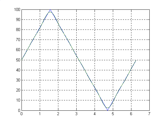 Программа. U1=[];U2=[];U3=[]; U4=[];U5=[];U6=[]; for Wt=0:0.002*pi:2*pi; Um=50;a=pi/2; uu=Um+(4*Um/(a*pi))*(sin(a)*sin(Wt)+(1/9)*sin(3*a)*sin(3*Wt)+(1/25)*sin(5*a)*sin(5*Wt)+(1/49)*sin(7*a)*sin(7*Wt)); U6=[U6 uu]; if 0 u=50+(50/(pi/2))*Wt; U1=[U1 u]; elseif (pi/2) u=50+50-(50/(pi/2))*(Wt-pi/2); U2=[U2 u]; else u=50-50+(50/(pi/2))*(Wt-(3/2)*pi); U3=[U3 u]; end U=[U1 U2 U3]; U6; end Wt=0:0.002*pi:2*pi; plot(Wt,U,Wt,U6),grid Результат.