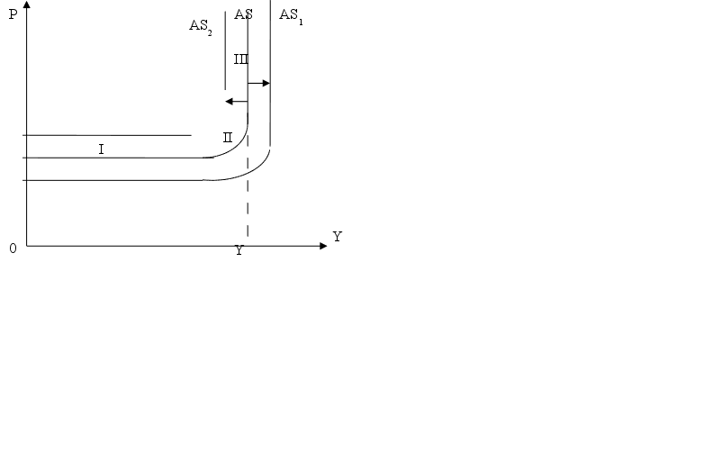 ВЛИЯЮЩИЕ Совокупное предложение – это общее количество конечных товаров и услуг, произведенных в экономике (в стоимостном выражении), то есть реальный ВНП. Кривая совокупного предложения – AS (см. рисунок 6) показывает, какой объем совокупного выпуска может быть предложен производителями при разных значениях уровня цен в экономике. В учебнике «Экономической теории» под редакцией Сумцовой Н. В. Говорится, что “более высокие уровни цен создают стимулы для увеличения выпуска продукции и предложения ее к продаже, и наоборот, более низкие цены вызывают сокращение производства продукции, то есть зависимость между уровнем цен и объемом национального производства – прямая. При этом рост производства сопряжен с сокращением безработицы, тогда как в периоды спада безработица, тогда как в периоды спада безработица быстро растет”. /7, c.387/. Цены, по которым производители готовы продавать данный объем продукции, зависят от издержек, поэтому и форма кривой совокупного предложения AS зависит от того, что происходит с издержками на единицу продукции, а потому – и с ценами, которые должны позволить фирмам покрыть издержки и получить прибыль. Кривая AS состоит из трех отрезков: горизонтального, промежуточного (восходящего) и вертикального. На графике символом Y обозначен потенциальный уровень реального объема национального производства при полной зависимости. Кейнсианский отрезок (I) соответствует спаду в экономике, которому присуща безработица; материальные ресурсы также используются не на полную мощность. В таких условиях можно расширить производство без увеличения издержек на единицу продукции и повышения цен, так как вовлекаются незагруженное оборудование и незанятая рабочая сила. На промежуточном отрезке (II), когда в производстве появляются узкие места и используются менее эффективное оборудование и менее квалифицированные работники, издержки на единицу продукции растут. Поэтому на данном отрезке при расширении объема производства должны повышаться и цены.