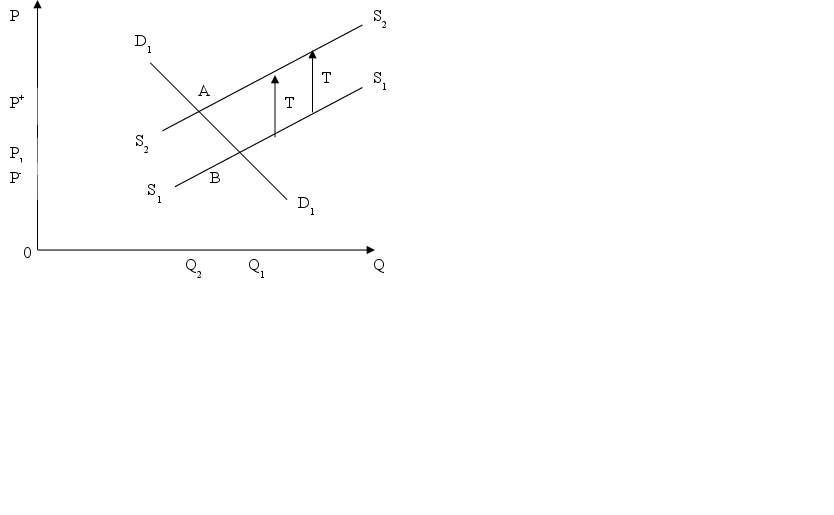 Государство воздействует на рынок, во-первых, с помощью налогов, которые оно устанавливает на продаваемые товары, во-вторых, с помощью установления максимальных или даже фиксированных цен на некоторые товары и в первую очередь на предметы первой необходимости. Налоги, которые платит производитель, заставляют его повышать цены на продаваемые товары, в результате цена на товар возрастает, что приводит к понижению спроса на него. По данной причине равновесная цена превысит ту, которая была без налога. Га графике это изображается путем поднятия точки пересечения кривой предложения и спроса, поскольку сдвигается вверх кривая предложения (см. рисунок 7). Значительную долю налога производитель стремится переложить на покупателя, хотя сам тоже несет потери. Но налоги необходимы государству для финансирования бюджета и реализации социальных программ. Вмешательство государства в рыночный механизм является неизбежным, ибо без этого невозможно защитить, например, интересы малообеспеченных слоев населения.