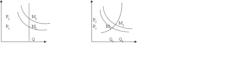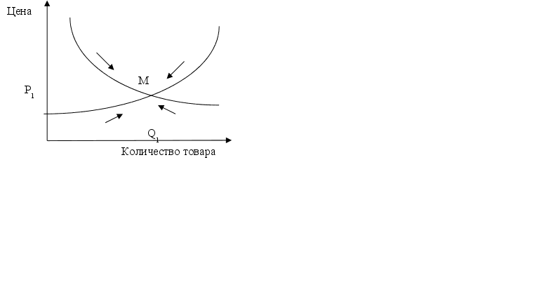 Рисунок 3 – Взаимодействие спроса и предложения Рыночное равновесие, определяемое через равенство объемов продаж и покупок, предполагает соблюдение определенных условий. Во-первых, мы рассматриваем его по отношению к какому-либо отдельному виду товара, а от изменения цен других товаров при этом абстрагируемся, считая их цены неизменными. Ясно, что в реальном рыночном механизме это условие не соблюдается, но тем не менее для теоретического анализа всегда приходится рассматривать сначала явления или факторы обособленно, по одному, и только потом вводить поправки и усложнения. Во-вторых, следует учитывать, что при этом не происходит увеличения доходов покупателей, цены конкурирующих с данным товаром предметов и других факторов. Обычно, когда формулируют изменение спроса и предложения, а также условий рыночного равновесия, то оговаривают, что указанные соотношения имеют место лишь «при прочих равных условиях». Последняя фраза как раз и указывает, что рассматриваемые рыночные отношения применимы к некоторому идеальному рынку совершенной конкуренции, в котором отсутствуют монопольные цены. Кроме того, всегда имеется в виду, что другие факторы, о которых говорилось выше, при этом не учитываются. Поэтому равновесие между спросом и предложением в данном случае принято называть частичным, поскольку оно касается только некоторого частного товара и не рассматривает процесс изменения равновесной цены с течением времени. Проблему изменения такой цены в зависимости от времени подробно исследовал А. Маршалл, который ввел понятия мгновенного, краткосрочного и долгосрочного равновесия. При мгновенном равновесии предложение товара не меняется, но в связи с увеличением спроса равновесная цена на него увеличивается. Типичным примером может служить продажа скоропортящегося товара, например, рыбы, фруктов и иных продуктов, которые необходимо реализовать за короткое время. Эту ситуацию можно изобразить на графике путем передвижения точки равновесия вверх по прямой линии, изображающей постоянное предложение (см. рисунок 4а). Краткосрочное равновесие устанавливается за более длительный промежуток времени, когда предложение увеличивается, но число предприятий, производящих товар, не меняется. Убедившись в том, что данный товар пользуется спросом, то же самое число предприятий начинает интенсивно его производить. При этом равновесная цена будет, конечно, ниже той, которая возникает при мгновенном равновесии (см. рисунок 4б).