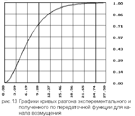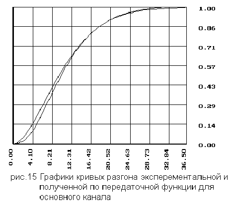 5. Аппроксимация методом Симою. С помощью программы ASR в пункту аппроксимации последовательно считаем площади каждой из кривой разгона для последующего получения уравнения передаточной функции. Для кривой разгона по внешнему контуру для объекта второго порядка получаем следующие данные: Значения площадей: F1= 6.5614 F2= 11.4658 F3= -4.5969 F4= -1.1636 F5= 44.0285 F6= -120.0300 Ограничимся второй площадью. F1 a1 = F1 + b1 a2 = F2 + b2 + b1 F2 a3 = F3 + b3 + b2 F1 + b1 F2 a1 = 6.5614 + b1 a2 = 11.4658 + b1 6.5614 0 = - 4.5969 + b1 11.4658 Решив систему получаем : b1 = 0.4 a1 = 6.9614 a2 = 14.0904 Тогда передаточная функция объекта второго порядка по внешнему контуру имеет вид: 0.4 s W(s)=----------------------------- 2 14.0904 s + 6.9614 s + 1 Для кривой разгона по внутреннему контуру для объекта второго порядка получаем следующие данные: Значения площадей: F1= 9.5539 F2= 24.2986 F3= -16.7348 F4= -14.7318 F5= 329.7583 F6= -1179.3989 Для определения передаточной функции решаем систему, так как F3 a1 = 9.5539 + b1 a2 = 24.2986 + 9.5539 b2 0 = -16.7348 + b1 24.2986 Решив систему получаем : b1 = 0.6887 a1 = 10.2426 a2 = 30.8783 Тогда передаточная функция объекта второго порядка по внутреннему контуру имеет вид: 0.6887 s + 1 W(s) = ----------------------------- 2 30.8783s + 10.2426 s + 1 Для кривой разгона по заданию для объкта третьего порядка с запаздыванием получаем следующие данные: Значения площадей: F1= 10.6679 F2= 38.1160 F3= 30.4228 F4= -46.5445 F5= 168.8606 F6= -33.3020 Так как F3 1 W(s) =------------------------------- 2 38.1160 s + 10.6679 s + 1 6. Проверка аппроксимации методом Рунге - Кутта. В программе ASR в пункте передаточная функция задаем полученные передаточные функции. И затем строим графики экспериментальной и аналитической кривых разгона (по полученной передаточной функции). 6.1 Для кривой разгона по внешнему контуру Устанавливаем для проверки методом Рунге-Кутта конечное время 27c, шаг 0,5с.