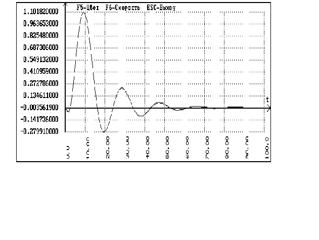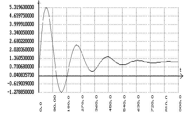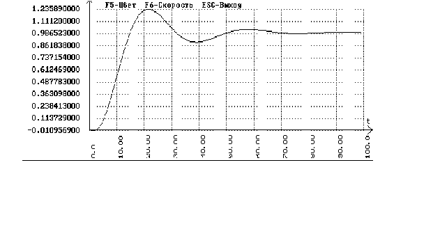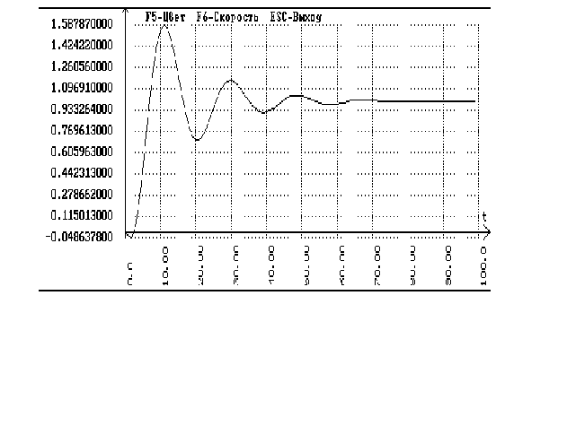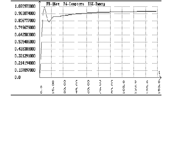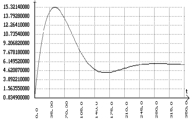 Так как настройки регулятора не могут быть отрицательными то ограничимся 3 квадрантом. И с помощью программы на BASIC рассчитаем оптимальные настройки для ПИ - регулятора методом Стефани по следующим формулам: A^2(m,w) m 1 Tu = ------------------------ , kp = ---------- - ---------- w(m^2+1)* v(m,w) v(m,w) u(m,w) наибольшее отношение kp/Tu и будет оптимальными настройками. Получили что kp = 1.712763 Tu = 4.47537 В программе SIAM с помощью схемы для одноконтурной системы без запаздывания получаем переходные процессы по заданию и по возмущению: