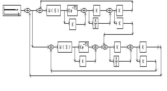 Реферат: Расчет настроек автоматического регулятораРеферат: Расчет настроек автоматического регулятораПермский Государственный Технический Университет Курсовая работа по предмету: Автоматизация технологических процессов и производств. Тема: Расчет настроек автоматического регулятора. Выполнил: ст-т гр. АТП-93 Никулина Д. В. Проверил: Бильфельд Н. В. г. Березники, 1998 Содержание. 1. Координаты кривых разгона. 1.1 Схемы для Ремиконта. 1.2 Координаты и график кривой разгона по возмущению. 1.3 Координаты и график кривой разгона по заданию. 1.4 Координаты и график кривой разгона по управлению. 2. Интерполяция по 3 точкам. 2.1 Линейное сглаживание и график кривой разгона по возмущению. 2.2 Линейное сглаживание и график кривой разгона по заданию. 2.3 Линейное сглаживание и график кривой разгона по управлению. 3. Нормирование кривых разгона. 3.1 Нормирование кривой разгона по возмущению. 3.2 Нормирование кривой разгона по заданию. 3.3 Нормирование кривой разгона по управлению. 4. Аппроксимация методом Симою. 4.1 По возмущению. 4.2 По заданию. 4.3 По управлению. 5. Проверка аппроксимации методом Рунге - Кутта. 5.1 По возмущению. 5.2 По заданию. 5.3 По управлению. 5.4 Сравнение передаточных функций. 5.5 Сравнение кривых разгона. 6. Расчет одноконтурной АСР методом Роточа. 1. Задание Исследовать работу комбинированной автоматической системы управления в целом и ее отдельных контуров. Провести расчет оптимальных настроечных параметров регуляторов АСР.
