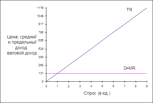 Вот реальный пример неравномерного обобщения: то, что верно для отрасли или группы фирм (нисходящая, менее эластичная, чем совершенно эластичная кривая спроса), неверно для самостоятельной фирмы (совершенно эластичная кривая спроса). Средний, валовой и предельный доход Очевидно, что кривая спроса на продукцию фирмы является в то же время кривой дохода. То, что в столбце (1) табл. 1 обозначено как цена на единицу продукта для покупателя, представляет собой выручку от продажи единицы продукта, или средний доход продавца. Утверждение о том, что покупатель должен заплатить цену 131 дол. за единицу продукта, тождественно следующему тезису: выручка от продажи единицы продукта, или средний доход, полученный продавцом, составляет 131 дол. Цена и средний доход — это одно и то же, но с разных точек зрения. Валовой доход при любом объеме продаж можно легко определить путем умножения цены на соответствующее количество продукции, которое фирма способна продать. При умножении данных столбца (1) на данные столбца (2), получается результат, помещенный в столбце (3). В данном случае валовой доход увеличивается на постоянную величину — 131 дол. — с каждой дополнительной единицы продаж. Каждое проданное изделие прибавляет к валовому доходу свою цену. Всякий раз, когда фирма планирует какое-либо изменение объема производства, ее интересует, как изменится доход в результате этого сдвига в выпуске. Каким будет дополнительный доход от продажи еще одной единицы продукта? Предельный доход есть изменение валового дохода, то есть добавочный доход, который является результатом продажи еще одной единицы продукта. Как показано в столбце (3) табл. 1, валовой доход равен нулю, когда продано нуль единиц продукта. Первая проданная единица увеличивает валовой доход с нуля до 131 дол. Предельный доход — увеличение валового дохода в результате продажи первой единицы продукта - составляет, следовательно, 131 дол. Вторая проданная единица увеличивает валовой доход со 131 до 262 дол., то есть предельный доход опять составит 131 дол. В столбце (4) видно, что предельный доход есть постоянная величина, равная 131 дол., поскольку именно на такую неизменную величину возрастает валовой доход по мере каждой дополнительной единицы продукта. Таблица 1. Спрос на продукт самостоятельной фирмы и ее доход в условиях чистой конкуренции