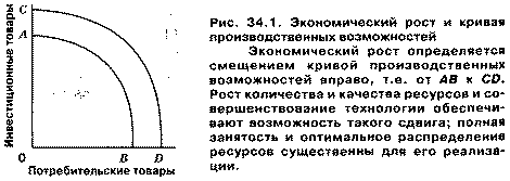 Почему экономический рост сам по себе обычно рассматривается как важная экономическая цель? Ответ очевиден. Увеличение общественного продукта в расчете на душу населения означает повышение уровня жизни. Рост реального продукта влечет за собой возрастание материального изобилия и отвечает принципам минимизации издержек. Ответ на поставленный вопрос может быть сформулирован и иным способом. Растущая экономика обладает большей способностью удовлетворять новые потребности и решать социально-экономические проблемы как внутри страны, так и на международном уровне. Экономический рост облегчает решение проблемы ограниченности ресурсов. Экономический рост позволяет обществу более полно реализовывать поставленные экономические цели и осуществлять новые широкомасштабные программы. Столь ли существенна разница между 5% и 3% экономического роста? Да, существенна, и весьма! Для России с ее огромным реальным ВНП разница между темпами роста в 3% и 5% выражается существенной суммой. Для населения очень бедной страны даже полупроцентное снижение в темпах экономического роста может означать голодную смерть. Кроме того, в течение ряда лет даже небольшие различия в темпах роста могут приобрести решающее значение. Очевидно также, что экономический рост имеет более важное значение, чем стабильность. Например, предотвратив экономический спад, можно единовременно увеличить национальный доход, скажем, на 6%. Если же годовые темпы экономического роста составят 3% , то рост национального дохода на 6% будет достигнут за 2 года; и в дальнейшем те же темпы экономического роста обеспечат увеличение национального дохода на 6% каждые два года. Факторы экономического роста Экономический рост любой страны зависит от следующих основных факторов: 1) количества и качества трудовых ресурсов; 2) объема основного капитала; 3) техники и технологии; 4) системы управления производством; 5) количества и качества природных ресурсов. Эти факторы делают рост производства физически возможным. Только доступность большого количества лучших по качеству ресурсов, включая технологический потенциал, позволяет увеличивать производство реального продукта. В то же время эти факторы обеспечивают не только полное вовлечение ресурсов в экономический оборот, но и наиболее эффективную их утилизацию, чтобы получить максимальное количество полезной продукции. Факторы, влияющие на экономический рост, взаимосвязаны. Например, безработица обычно замедляет темпы накопления капитала, а также рост расходов на научные исследования. И наоборот, низкие темпы внедрения нововведений и капиталовложения могут стать главной причиной безработицы. Общее представление о взаимодействии всех этих факторов может дать кривая производственных возможностей (рис. 34.1).