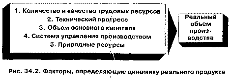 При всем значении фактора спроса на ресурсы основное внимание в обсуждении проблем экономического роста уделяется факторам предложения. Рисунок 34.2 дает нам схему влияния факторов, определяющих динамику реального продукта. Эта схема показывает, что увеличение реального продукта и дохода может осуществляться двумя основными способами: 1) путем вовлечения большего объема ресурсов и 2) путем более производительного их использования. Реальный ВНП можно представить как результат умножения трудозатрат на производительность труда. Что определяет количество отработанных часов? И от чего зависит производительность труда? Из рисунка 34.2 следует, что величина трудозатрат зависит от численности занятых и от продолжительности рабочей недели. В свою очередь, численность занятых зависит от численности населения в трудоспособном возрасте и уровня вовлеченности рабочей силы в производство, т.е. от доли трудоспособного населения, которое реально занято производством. Средняя рабочая неделя определяется правовыми и институциональными факторами, а также коллективными договорами. Производительность труда находится под воздействием таких факторов, как профессионализм, технический прогресс, фондовооруженность, качество рабочей силы и эффективность распределения и управления различными ресурсами. Другими словами, производительность труда увеличивается по мере улучшения здоровья, профессиональной подготовки, образования и повышения заинтересованности; по мере роста обеспеченности машинами и оборудованием, а также природными ресурсами; при лучшей организации и управлении производством; при перемещении рабочей силы из менее в более эффективные отрасли. Факторы, сдерживающие экономический рост Есть факторы, которые сдерживают рост производительности труда и реального национального дохода. Это: 1) несовершенная законодательная деятельность; 2) ослабление государственного вмешательства в дела частного бизнеса, касающиеся вопроса загрязнения среды, правил безопасности, охраны здоровья, условий труда. Среди прочих факторов, отрицательно влияющих на экономический рост, можно назвать недобросовестное отношение к труду и хозяйственные преступления, прекращение работы во время трудовых конфликтов, воздействие неблагоприятных погодных условий на сельскохозяйственное производство. Здесь, правда, необходимо обратить внимание на следующее. Повышение безопасности труда, чистые воздух и вода - все то, что характеризует качество жизни, вполне может быть достигнуто за счет замедления темпов роста производительности труда. Но вместе с тем повышение производительности труда может повлечь за собой и увеличение расходов на цели, чрезвычайно важные для общества (например, охрана окружающей среды). Из сказанного можно сделать вывод, что производительность труда отражает не все благосостояние общества, а всего лишь измеряет выработку на 1 чел./ч. Существует целый ряд других факторов, которые значительно влияют на темпы экономического роста. Обилие природных ресурсов является мощным позитивным фактором экономического роста, но это вовсе не означает, чта страны с недостаточными запасами обречены на невысокие темпы экономического роста. Так, в Японии природные ресурсы ограничены, а темпы экономического роста этой страны в послевоенн