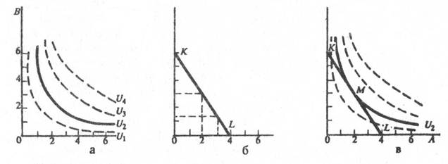 где MU – предельная полезность отдельных товаров, а P – их цена. Мы уже отмечали, что в маржиналистской теории важное место занимала проблема количественного измерения абсолютных величин предельной полезности. Что считать таким измерителем, т.е. в каких единицах будут оцениваться и сопоставляться предельные полезности благ? Возможно ли вообще найти такой показатель? В зависимости от ответа на эти вопросы, сторонники теории предельной полезности разделялись на два направления: кардиналистов и ординалистов. Первые были заняты поиском измерителя абсолютных величия предельной полезности. (У. Джевонс, А. Маршалл, Д. Робертсон и др.). Однако эти поиски не увенчались успехом и чаще всего при сравнении использовались денежные оценки полезности. Ординалисты же в принципе отказались от поиска такой универсальной единицы и предложили иной подход (В. Парето, Дж. Хикс и др.). Так, В. Парето высказал идею о том, что вместо абсолютных измерений предельной полезности плодотворнее было бы перейти к анализу относительному, а именно: определить предпочтение одних комбинаций товаров покупателей (потребителей) другим комбинациям, или наборам товаров. Инструментом такого анализа явились так называемые кривые безразличия, которые широко используются неоклассической школой при исследовании многих микроэкономических процессов. Равновесие потребителя может быть показано графически с помощью выше названных кривых безразличия. Возьмем потребителя, располагающего фиксированным денежным доходом, который он целиком тратит на потребление. Для простоты предположим, что он покупает только два вида товаров: А и В. Очевидно, что имеются некоторые комбинации количества этих товаров, которые дают равную общую полезность для потребителя (например, два товара А и три товара В имеют такую же общую полезность, как три товара А и два товара В и т.д.). Отказ от одного из товаров компенсируется получением другого товара в большем количестве. К этим комбинациям товаров А и В потребитель, следовательно, в равной мере безразличен. Если эти комбинации покажем графически, то получим плавную кривую безразличия U2 (рис. 3). Эта кривая проведена таким образом, что если бы потребитель мог выбрать любую точку на ней, то они были бы для него одинаково желательны, и ему было бы совершенно все равно, какую комбинацию он получит. Кривая U2 – это лишь одна из бесчисленного множества возможных кривых. Если возьмем более высокий уровень удовлетворения потребности, то кривая примет иной вид. На рис. 3 пунктирной линией показаны лишь некоторые из возможных кривых безразличия для данных товаров А и В. Ранее условились, что потребитель имеет фиксированный денежный доход. Пусть он тратит 6 руб. в день, причем товар А стоит 1,5 руб., а товар В – 1 руб. Ясно, что потребитель может израсходовать свои деньги на любую из возможных комбинаций товаров А и В в пределах 6 руб. На рис. 4 прямая линия KL – это линия возможностей потребления для данного потребителя. Наложим теперь линию KL на график кривых безразличия (рис. 5). Потребитель при данном уровне дохода может перемещаться только по прямой KL. Куда он будет перемещаться? Очевидно, к точке, где он получит наибольшую полезность, т.е. к наивысшей возможной кривой безразличия. В точке М линия возможностей потребления KL касается кривой безразличия U2. Это и е