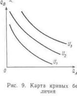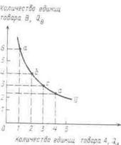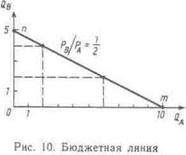 Рис. 7. Выгода покупателя ;••„' Потребитель готов купить 6 еди- -•; виц продукции и заплатить 5 дол. за _ каждую единицу. Но если бы на рынке была лишь одна единица, то - он готов был бы заплатить 10 дол., за две — 9, за три — 8 дол. и т. д. : При покупке 6 единиц образуется ,: разность между тем, что каждая единица стоит (значит) для потребито- ;' ля, и тем, что он реально за нее заплатил. Складывая эти разности, по- ', лучн-м 5+4+3+2+1=15 дол. сово- - хупной выгоды потребителя. Рис. 8. Кривая безразличия Потребитель безразличен к выбору между товарными наборами вдоль кривой и. Наборы а, Ь, с, с) доставляют ему одинаковое удовлетворение. Наклон кривой безразличия в каждой точке показывает предельную норму ламсщения — как много товара В потребитель готов пожертвовать для получения единицы товара А. лишь должен «ранжировать» товар в зависимости от своего предпочтения, т. е. решить, какое количество и каких товаров он хочет потребить. Если потребителю все равно, какую комбинацию товаров предпочесть, то тогда он находится в положении безразличия. Графическим изображением этого является кривая безразличия. Ее название объясняется тем, что в каждой точке имеет место набор, дающий одинаковое удовлетворение потребителю. Кривая безразличия есть график всех альтернативных комбинаций двух товаров, доставляющих одинаковое удовлетворение и к выбору из которых потребитель индифферентен. Кривая имеет снижающийся наклон, означающий, что чем больше одного товара входит в набор, тем меньше •количество другого. Иными словами, единственный способ для потребителя сохранить общее удовлетворение при снижении потребления товара — увеличить потребление другого (рис. 8). Кривая безразличия показывает, что норма замещения одного товара другим, т. е. готовность потребителя заменить потребление одного товара другим, неодинакова в .разных точках кри- вой (т. е. при различных наборах) и имеет тенденцию уменьшаться. Чем больше товара А потребляет потребитель по отношению к товару В. тем от меньшего количества товара В он готов отказаться .в пользу А. Если по каким-то причинам потребитель может увеличить в наборе количество товаров Л и В, то общий уровень его удовлетворения повышается (кривая безразличия 'сдвигается вправо). Совокупность кривых безразличия образует карту 'кривых безразличия. Чем выше кривая безразличия, тем выше благосостояние потребителя (рис. 9). В какой точке карты безразличия находится потребитель, зависит от относительных цен и его дохода. С точки удовлетворения потребности потребителю безразлично, какой набор (вдоль .кривой безразличия) он получит. Однако каждый предмет в наборе имеет разную цену. А поскольку бюджет потребителя ограничен, то и его выбор получает ограничения. Существует ряд возможных комбинаций двух товаров, которые потребитель способен оплатить из имеющегося в его распоряжении бюджета. График этих возможностей образует бюджетную линию (ряс. 10).