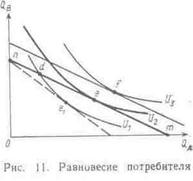 Бюджетная линия—.все комбинации товаров, которые потребитель способен приобрести гари данном доходе и данных ценах. Бюджетная линия показывает возможный выбор для потребителя. Таким образом, кривая безразличия показывает, что потребитель хотел бы купить, а бюджетная линия показывает, что потребитель ^может купить. Комбинация кривой безразличия и бюджетной линии определяет, что потребитель вероятнее всего купит, поскольку его желания совпадут с его возможностями. Потребитель достигает равновесия, выбирая такой потребительский набор на бюджетной линии, который максимизирует его удовлетворение. Потребитель .может расположиться в любой точке бюджетной линии, но рациональный потребитель—в максимально достижимой точке кривой безразличия, т. е. в точке, где бюджетная линия касательна к кривой безразличия. В этой" ; точке достигается ра.вновесие потребителя. В этой точке предельная яорма субституция равна отношению цен товаров. Положение равновесия потребителя может измениться, есля изменяются доход и относительные цены (рис. 11). При измене- Оптимальное потребление достигается в точке е. Точка А тоже находится на бюджетной линии пт, но хуже е (хуже наборов в этой точке), так как она находится на более низкой кривой безразличия vi, т. е. при худшем благосостоянии потребителя, где последний не использует всех возможностей своего бюджета. Набор в точке { лучше 'набора в е, но он недостижим для потребителя из-за уровня его дохода при ,; существующих ценах на товары. В е :°- бюджетная линия касается кривой без--тразличия, и наклон кривой безразличия 1 равен наклону бюджетной линии. '<, Подобное положение равнознач-^Но равенству предельных полезностей ;:.отоА/рА=/по/рв на каждый доллар по ^-каждому товару