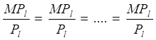 соотношения цен Предельная норма замещения характеризует норму, по которой фирма может замещать один ресурс другим в производстве, то есть речь идет о технологической взаимозаменяемости ресурсов. Соотношение цен ресурсов характеризует норму, по которой фирма может заменить один ресурс другим, покупая их на рынке, то есть, речь идет об экономической взаимозаменяемости ресурсов. Так как предельная норма технологической замены капитала трудом равна соотношению предельных продуктов, можно утверждать, что оптимум производителя будет достигаться при равенстве соотношения предельных продуктов и соотношения цен, причем: 1) если соотношение предельных продуктов будет превышать соотношение цен, то это значит, что выпуск может быть увеличен при тех же затратах путем замещения капитала – трудом. 2) если соотношение предельных продуктов будет меньше соотношения цен, это значит, что выпуск может быть увеличен при тех же затратах, путем замещения капиталом – труда. 3) если соотношение предельных продуктов равно соотношению цен, то любое изменение сочетаний ресурсов не улучшит положение фирмы. 2. Согласно второго подхода, оптимум производителя достигается при равенстве относительных предельных производительностей (-это предельный продукт в расчете на затраченный рубль). Равенство относительных предельных производительностей записывается